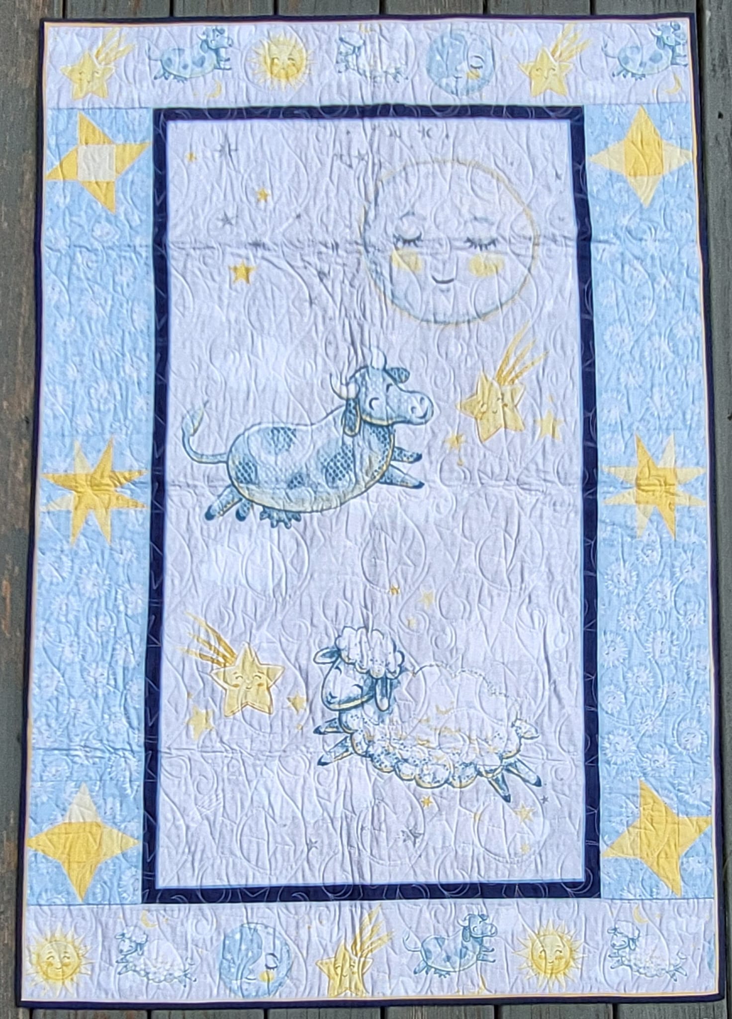 Charming details include playful motifs like a flying cow, a ship sailing the skies, and twinkling stars — all inviting your child to dream big. Measuring 34.5" x 51", this quilt is perfectly sized for cribs, stroller rides, or cozy snuggles, making it as versatile as it is enchanting.