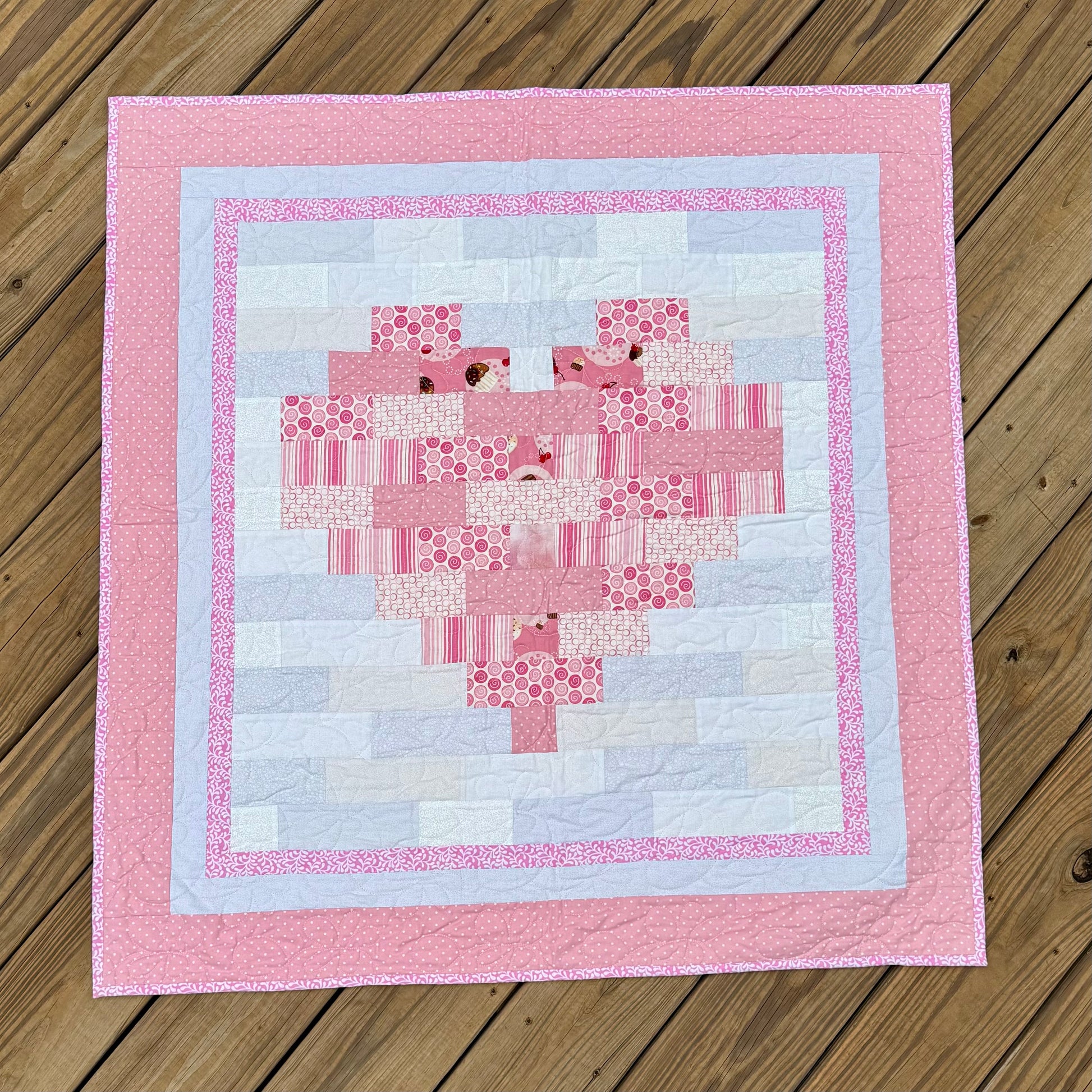 The Sweetheart Pink Baby Quilt is a charming handmade creation designed to wrap your little one in warmth and love. Measuring 37" x 38", it features a heart pattern in soothing pink tones, bringing a sweet touch to any nursery. The reverse side is crafted with soft pink fabric, perfect for tummy time or snuggles. Both beautiful and practical, this quilt makes a thoughtful gift for new parents and a cherished keepsake for years to come.