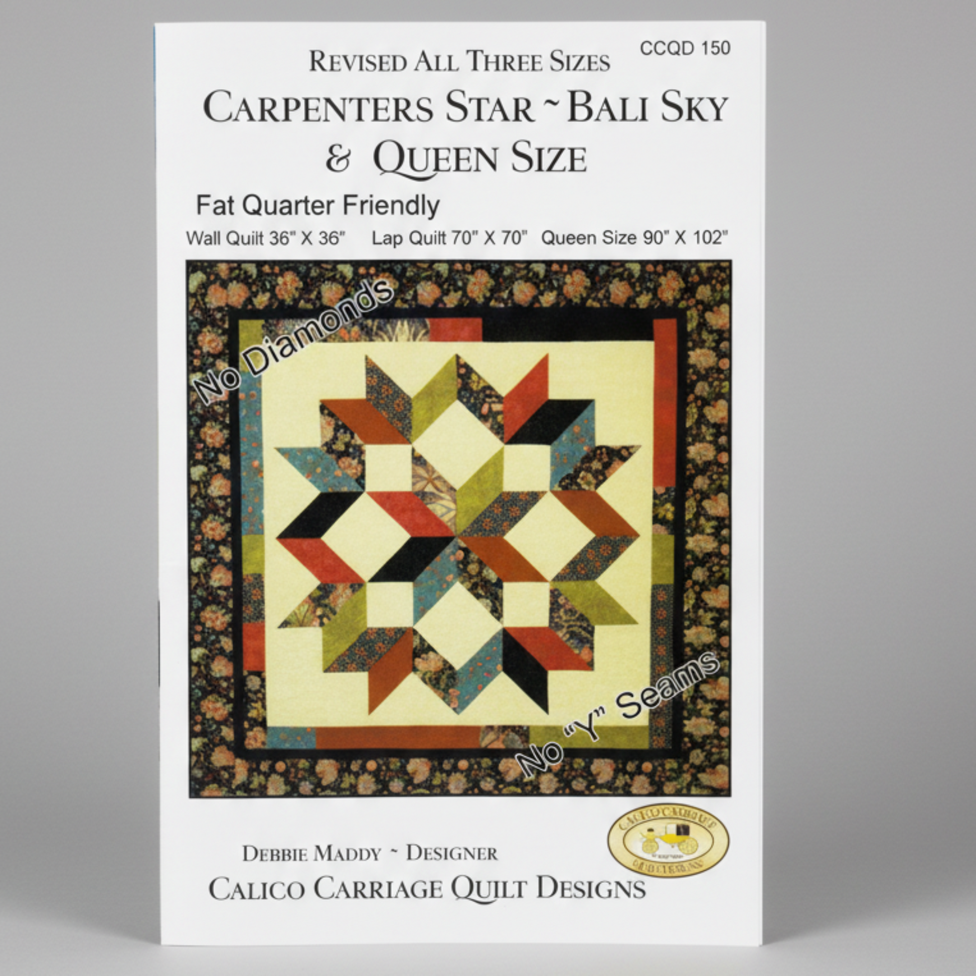 Experience the timeless charm of the Carpenter’s Star with the beautifully updated Bali Sky quilt pattern. This revised design offers three versatile sizes—Wall (36" × 36"), Lap (70" × 70"), and Queen (90" × 102")—making it perfect for home décor, gifts, or class projects.