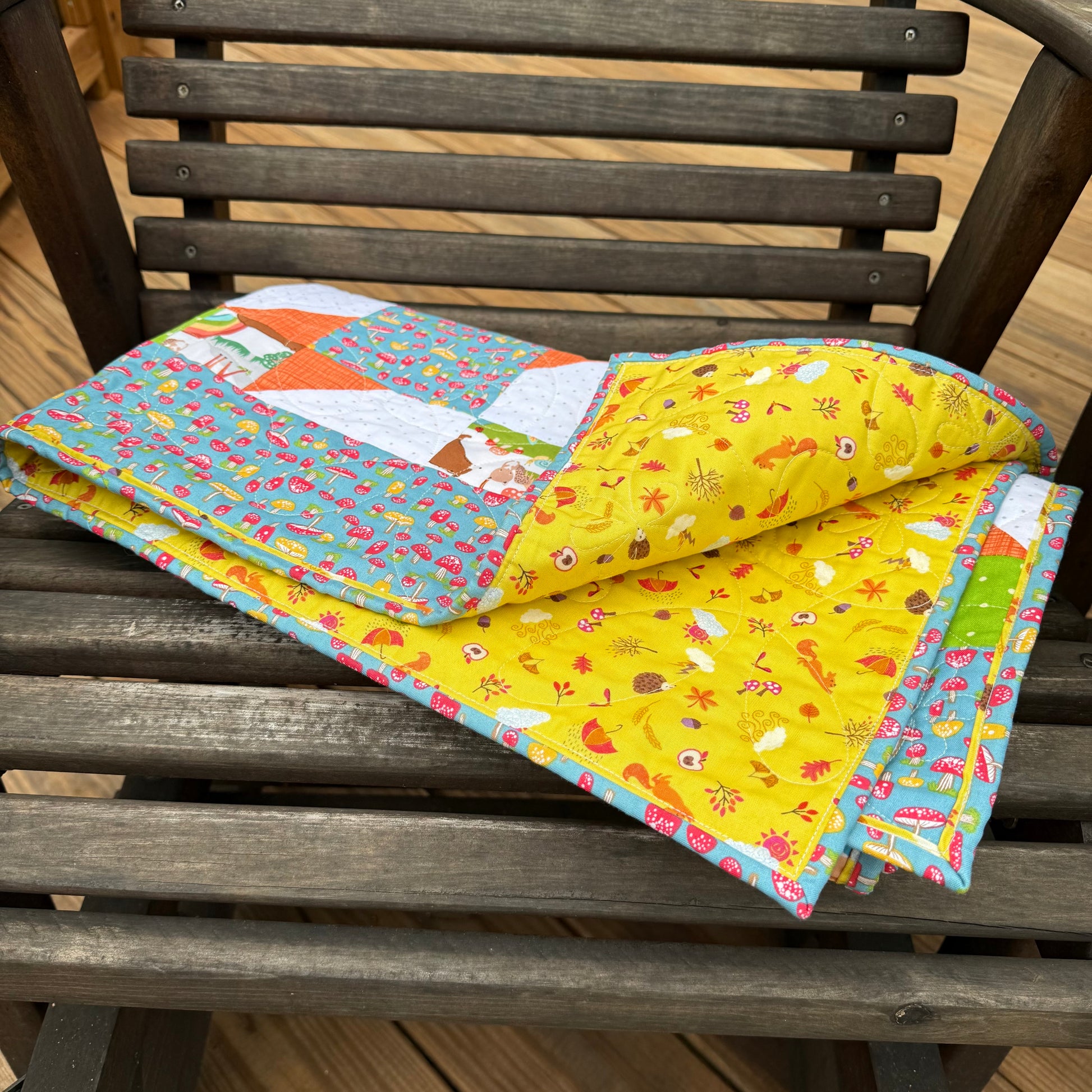 A playful woodland quilt, handmade with love, perfect for nurseries, play areas, or thoughtful baby gifts.
