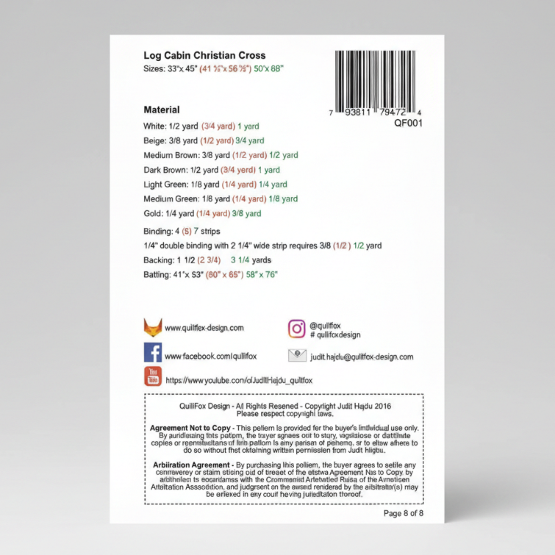 The Log Cabin Christian Cross Quilt Pattern by Judit Hajdu of QuiltFox offers a meaningful and elegant design using the classic Log Cabin block to form a striking Christian Cross. The pattern includes instructions for three sizes—33" × 45", 41" × 56", and 50" × 68"—making it ideal for wall hangings, lap quilts, gifting, or church décor.