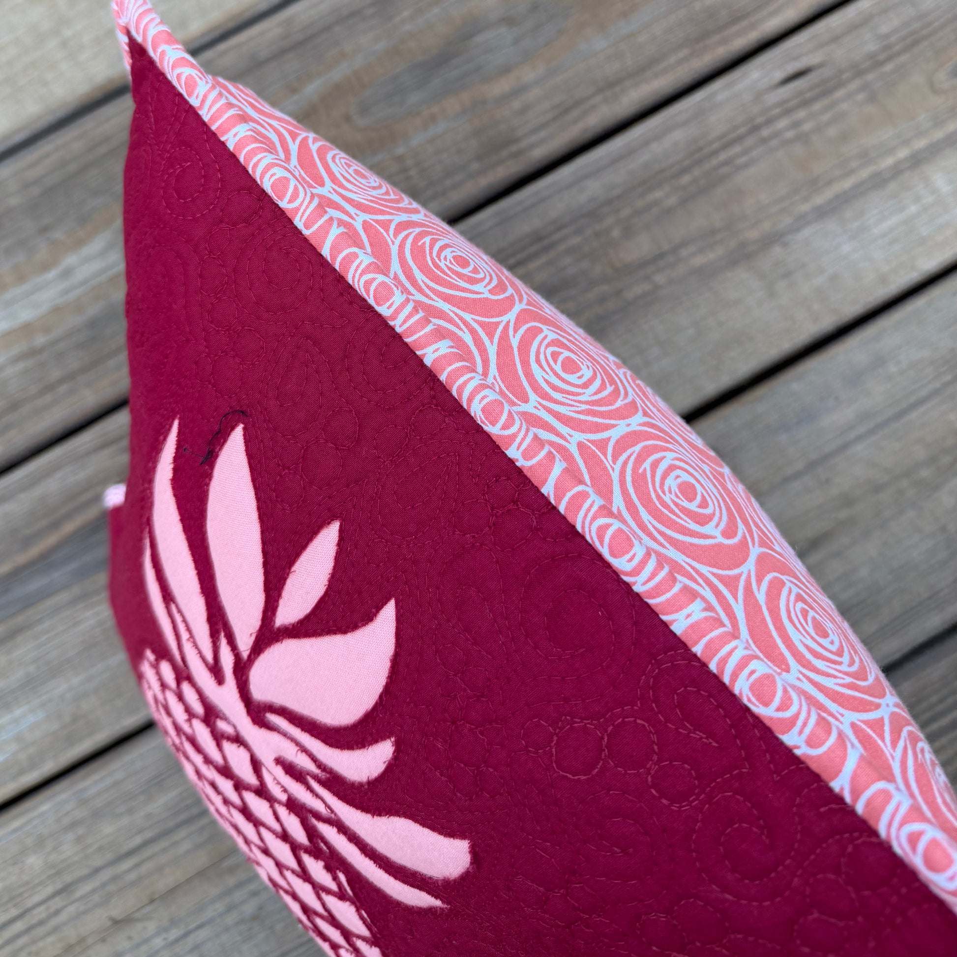 A 14.5" x 14.5" handmade reverse appliqué quilted pillow featuring a pineapple design in berry and blush tones. A bright, welcoming accent for any room.
