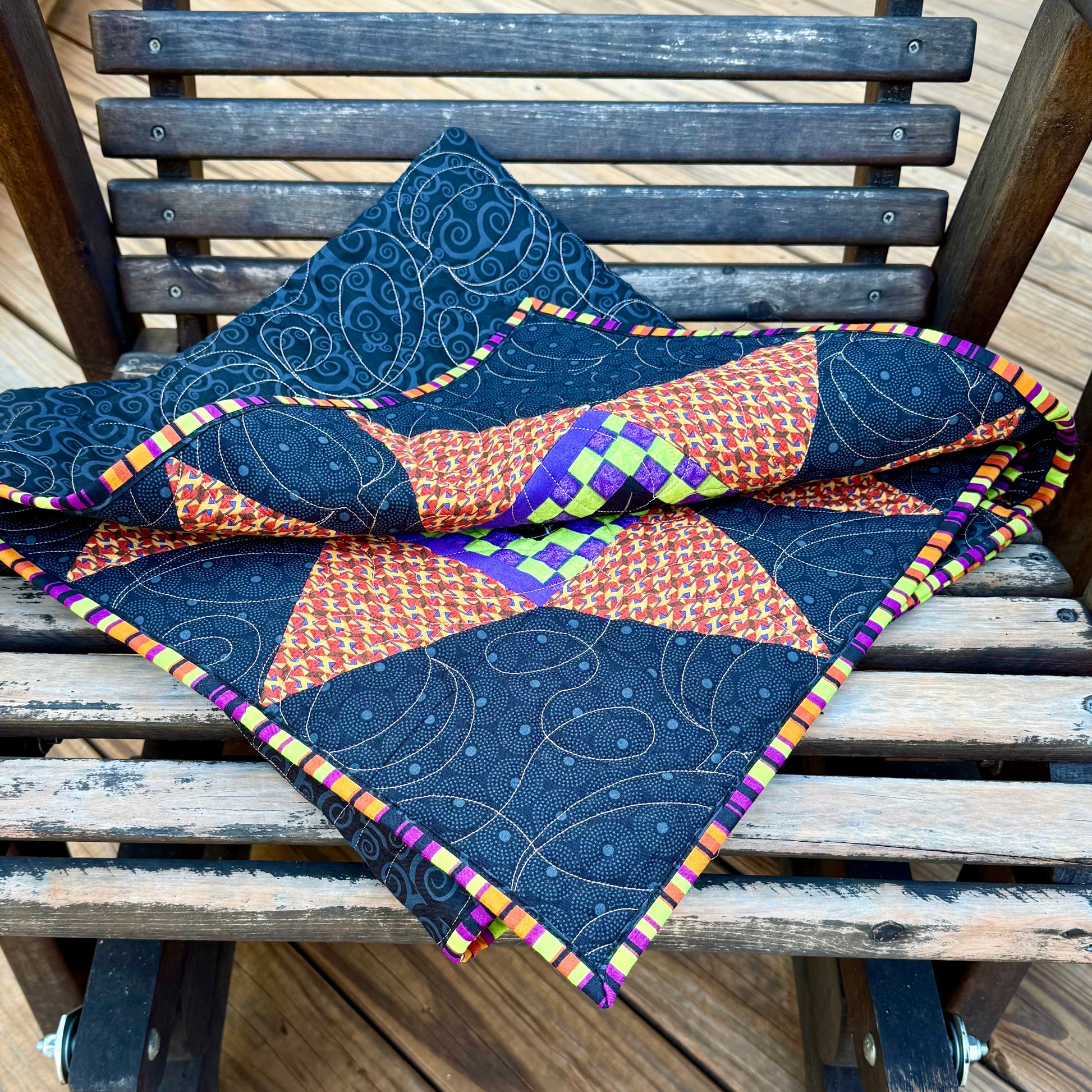 Meticulously pieced and quilted, it blends whimsy and craftsmanship, inviting smiles wherever it’s displayed. From its cheerful palette to its playful theme, Pumpkin Parade is a heartwarming tribute to the spirit of Halloween.