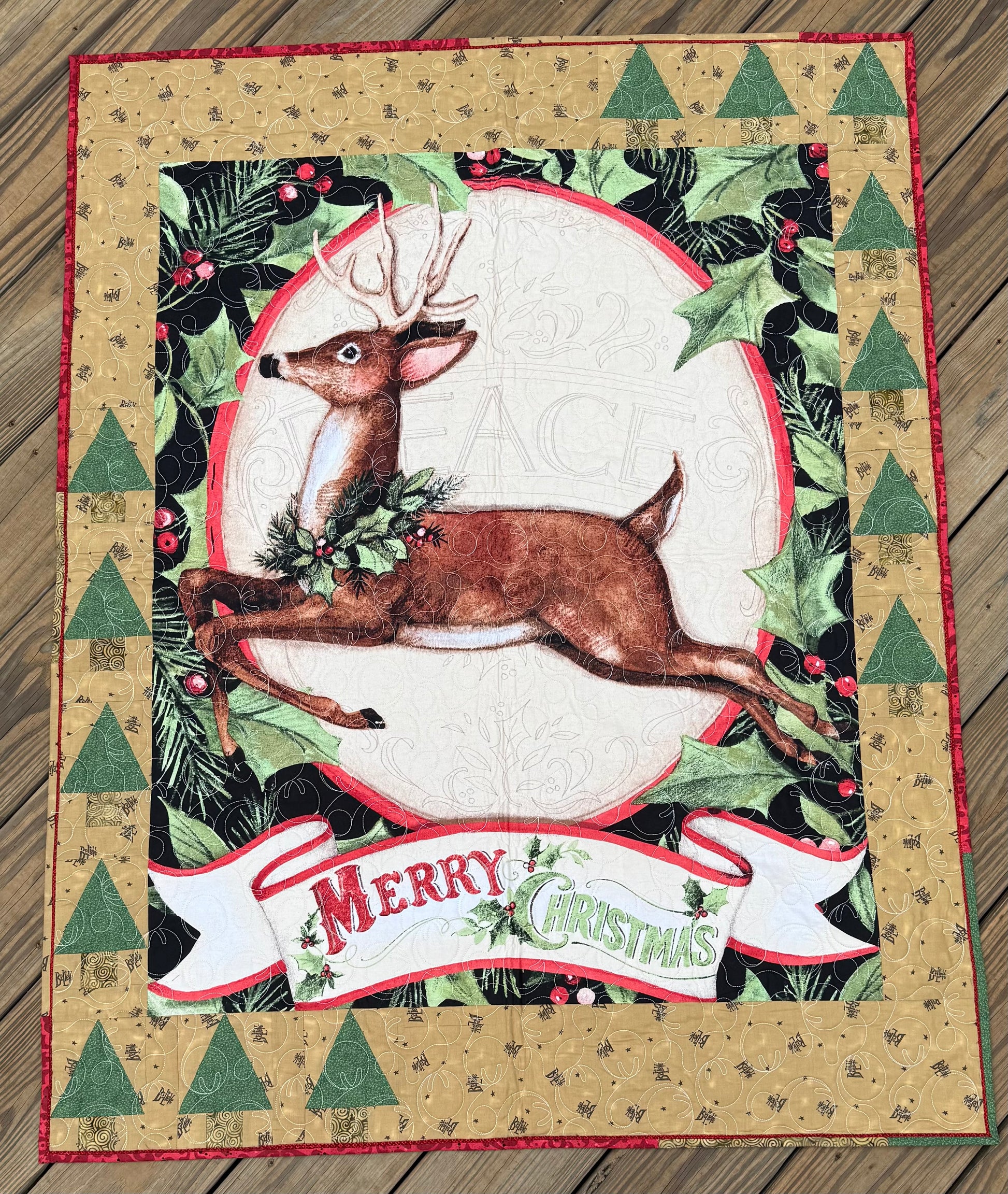 Festive holiday quilt featuring a reindeer, holly, and pine trees.
