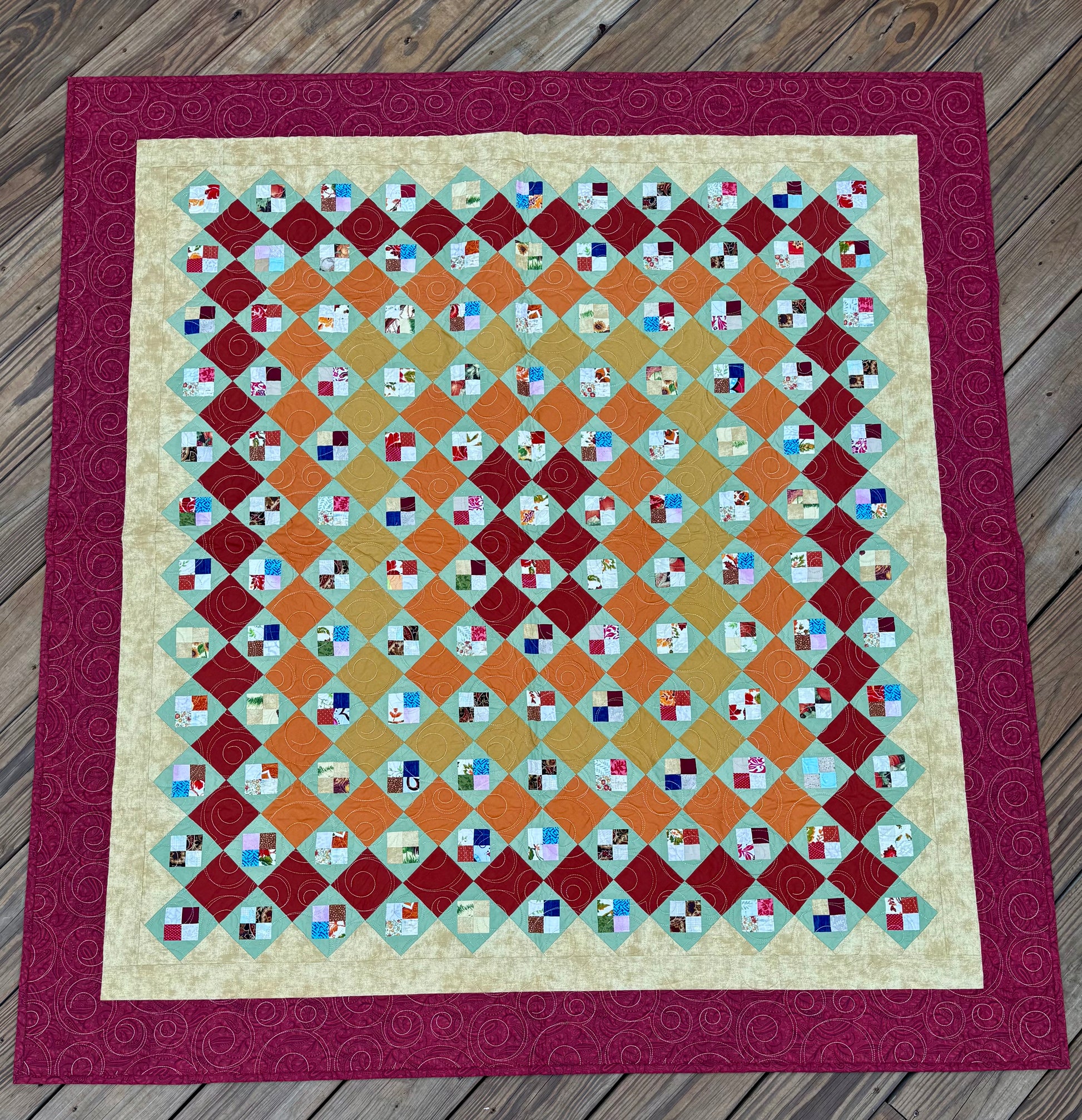 Embrace the cozy beauty of fall in your home. The Scrappy 4-Patch Quilt features a rich palette of brick red, orange, yellow, and green, with each block showcasing a charming scrappy 4-patch design. Measuring 60" x 78", this handmade quilt works perfectly as a large throw, cozy couch companion, or decorative topper for a full bed, adding warmth, texture, and seasonal charm to any space. Its vibrant autumn tones make it a standout accent piece.