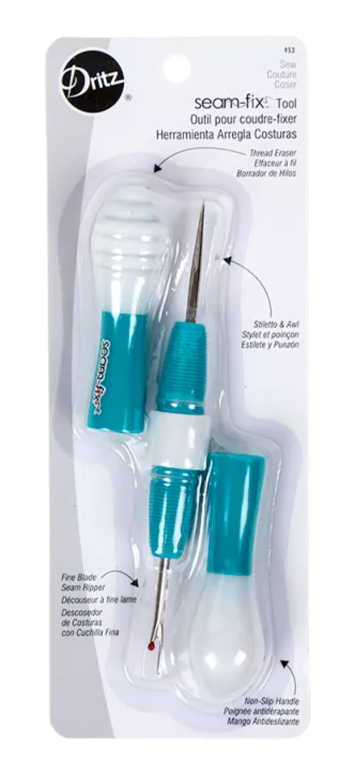The Dritz Seam-Fix Tool is a versatile 3-in-1 sewing essential, combining a seam ripper, awl, and stiletto in one compact design. Each end features a protective cap that doubles as a handle during use and a cover for safe storage. Perfect for sewing, quilting, and crafting, this handy tool is a must-have addition to your sewing kit.