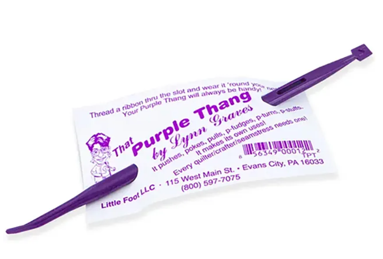 Meet That Purple Thang, the clever and compact sewing tool designed by Lynn Graves and beloved by quilters and crafters alike. This handy 6-inch purple plastic implement is your extra fingertip: ideal for pushing fabric under the pressor foot, turning out tight corners, poking stuffing, threading elastic, and so much more.