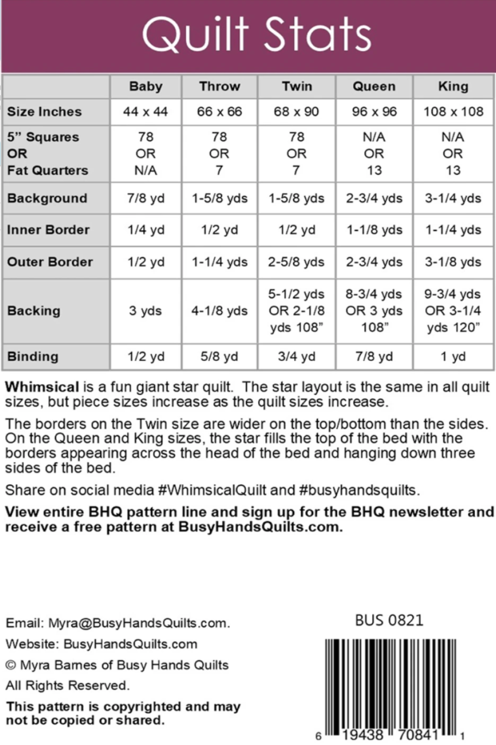 The Whimsical Quilt Pattern is a fun, fast design that lets your favorite prints shine—especially in its wide, eye-catching borders. Use 5" squares, Fat Quarters, or cut 10" squares into 5" squares to build this playful quilt.