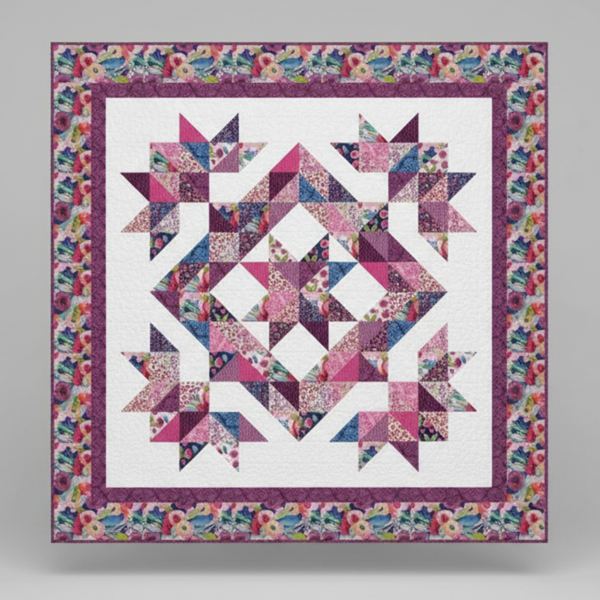 With varied border layouts based on quilt size, the design adapts beautifully: Baby – 44" × 44". Throw – 66" × 66". Twin – 68" × 90". Queen – 96" × 96". King – 108" × 108"