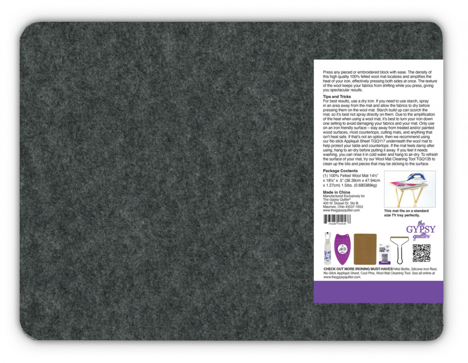 Press any pieced or embroidered block with ease. The density of this high-quality 100% felted wool mat localizes heat to the seams and stitches, effectively pressing both sides at once. An added bonus? The texture of the wool stops fabrics from shifting so there is no distortion when pressing. Tips and Tricks For best results, use a dry iron when pressing. When pressing an embroidered block, iron on the wrong side. The wool mat will cushion the stitches and retain the texture of the embroidery design. If the mat feels damp after use, hang to air-dry before storing. Wash the mat occasionally by rinsing it in cold water and hang the mat until dry. If you choose to use starch, wait to press the fabric until it is completely dry. . Starch build-up can scorch the mat if not cleaned properly. Recommended surfaces for the wool mat include Formica, Corian, stone, and metal (an ironing board). Please use a protective barrier like the No-Stick Applique Sheet TGQ117 between wood or painted surfaces and the Wool Mat. Never place the mat on a rotary cutting mat when pressing. The heat could warp the cutting mat.Color: Dark Gray