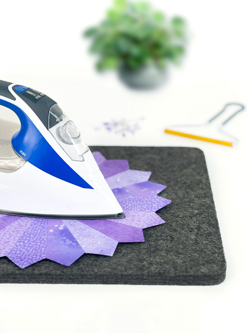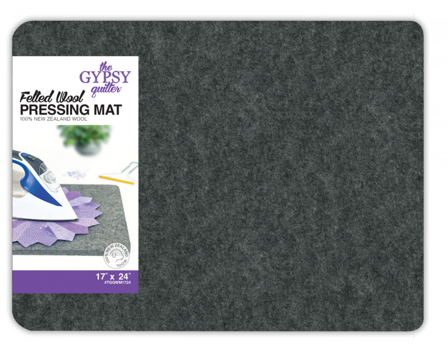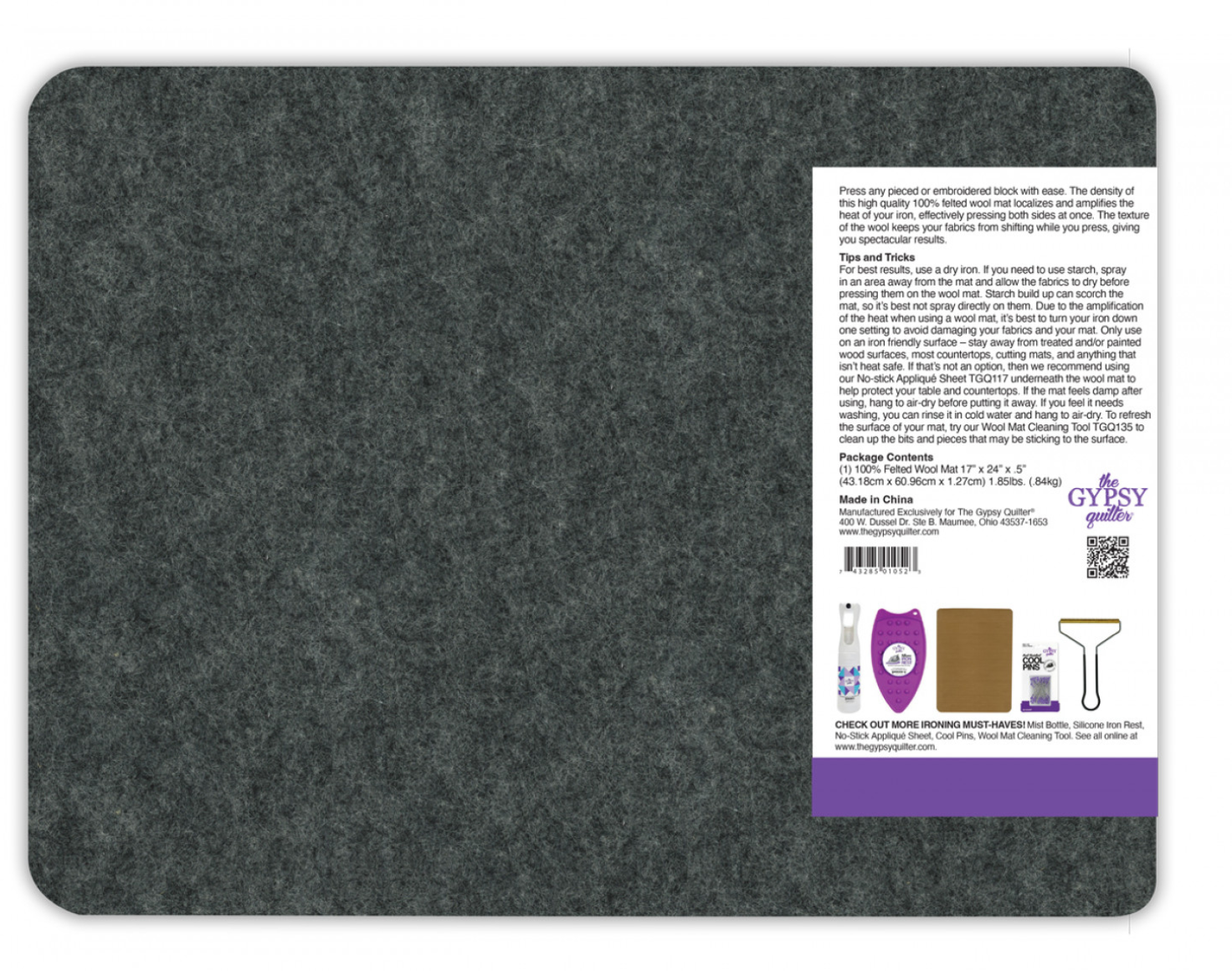 Press any pieced or embroidered block with ease. The density of this high-quality 100% felted wool mat localizes heat to the seams and stitches, effectively pressing both sides at once. An added bonus? The texture of the wool stops fabrics from shifting so there is no distortion when pressing. Tips and Tricks For best results, use a dry iron when pressing. When pressing an embroidered block, iron on the wrong side. The wool mat will cushion the stitches and retain the texture of the embroidery design. If the mat feels damp after use, hang to air-dry before storing. Wash the mat occasionally by rinsing it in cold water and hang the mat until dry. If you choose to use starch, wait to press the fabric until it is completely dry. Starch build-up can scorch the mat if not cleaned properly. Recommended surfaces for the wool mat include Formica, Corian, stone, and metal (an ironing board). Please use a protective barrier like the No-Stick Applique Sheet TGQ117 between wood or painted surfaces and the Wool Mat. Never place the mat on a rotary cutting mat when pressing. The heat could warp the cutting mat.